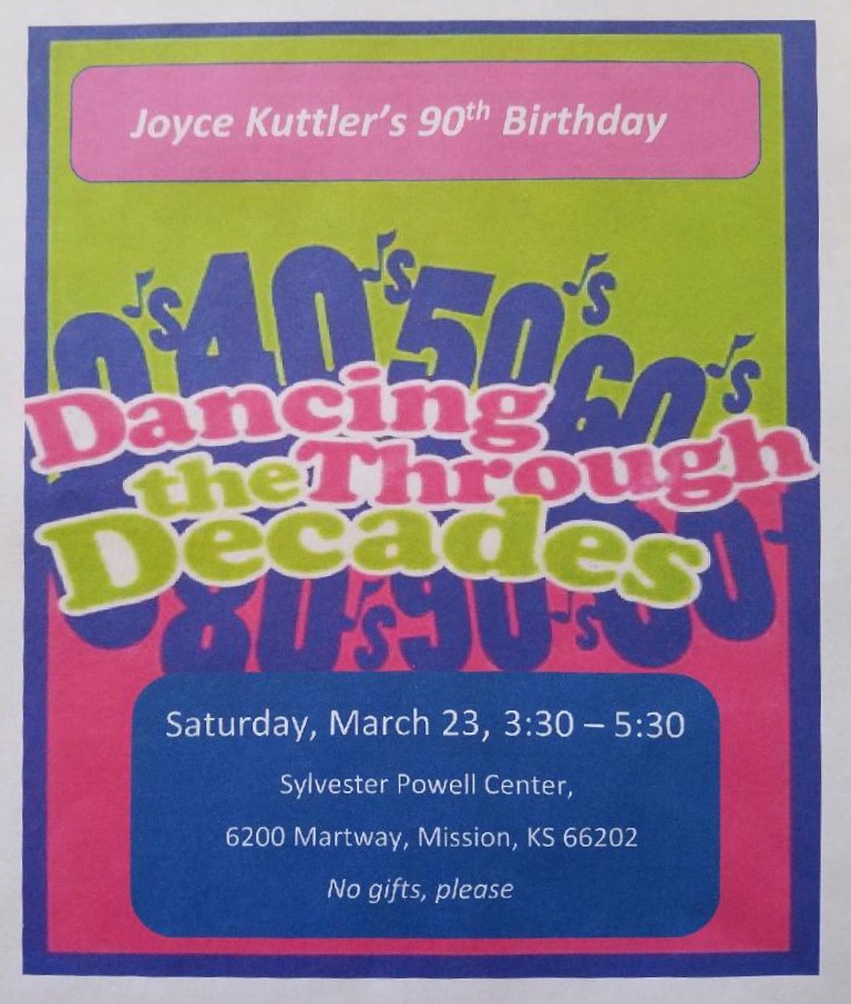 Come and join us for Dancing Through the Decades, a celebration of Joyce Kuttler’s 90th Birthday. The celebration will be at the Sylvester Powell Community Center (6200 Martway, Mission, KS) from 3:30-5:30 PM on Saturday, March 23, 2019. No presents please, just your presence!